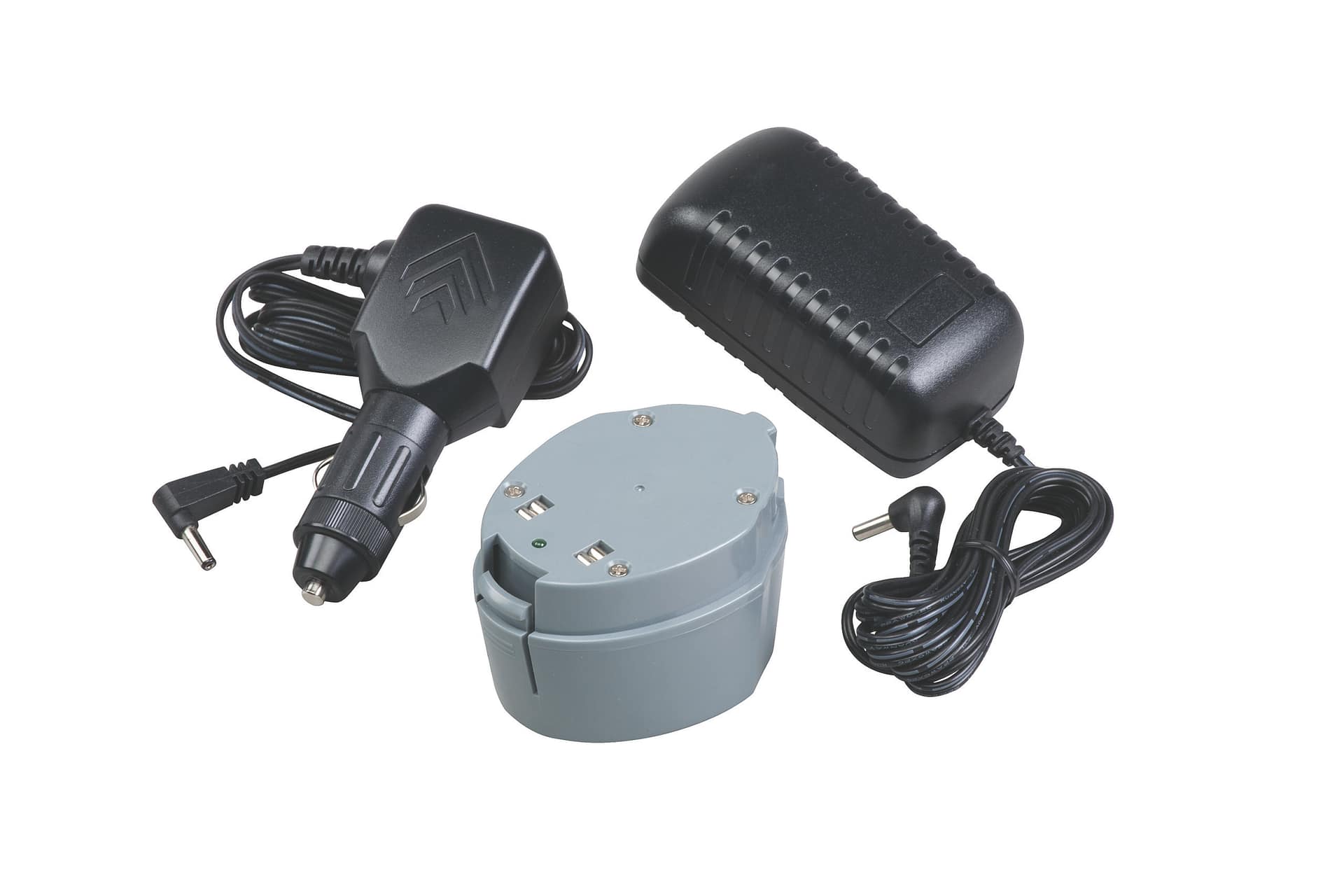 - Includes: Nebulizer, base, rechargeable 12-volt NiMH battery pack, 12-volt AC adapter, 12-volt DC auto adapter, child mask, adult mask, extension tube, nasal piece, two mouthpiece styles, five medication cups, one air filter, carrying tote, detailed English/ Spanish instruction manual, FAQ pamphlet and order form